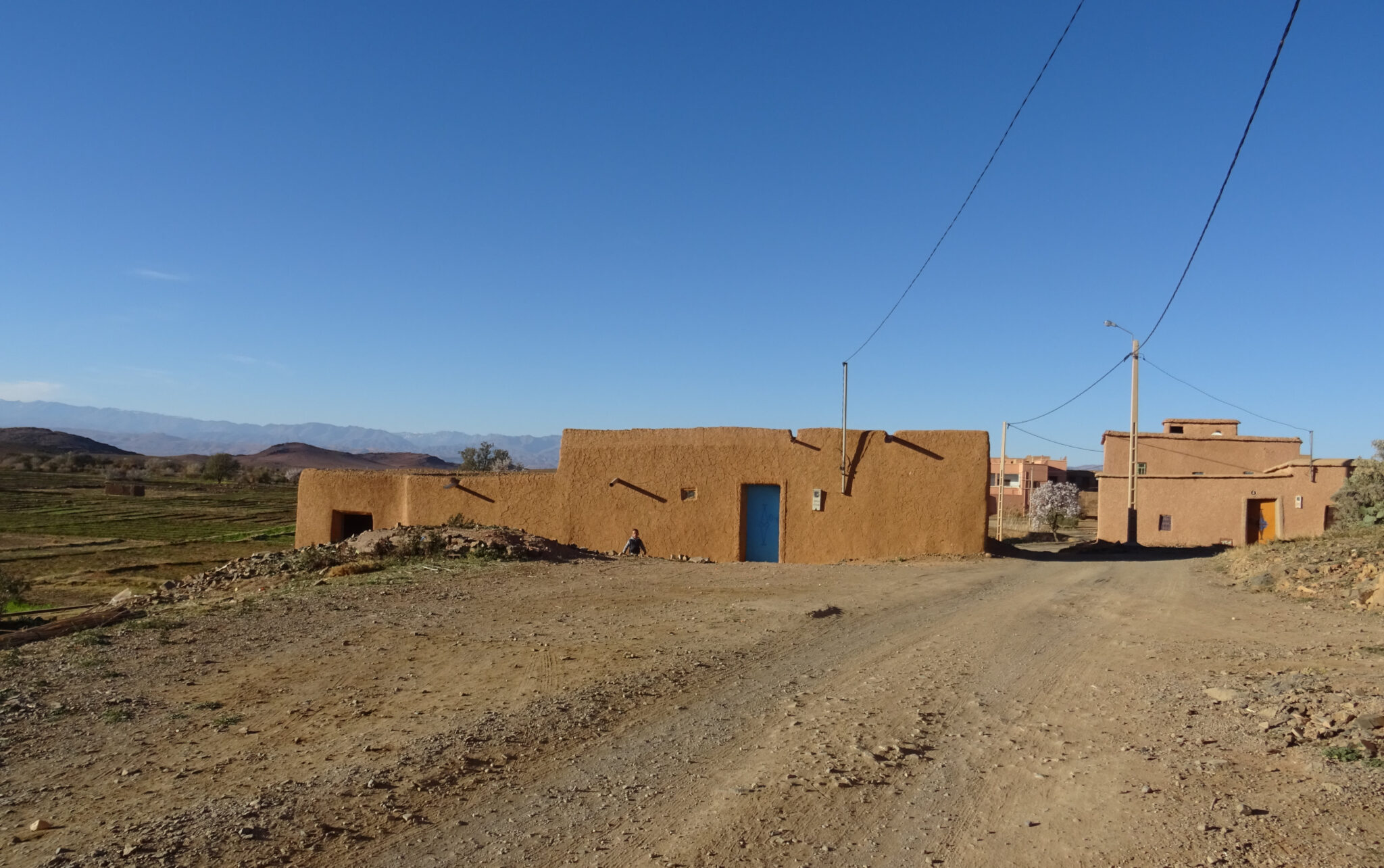 Au milieu de ce désert de roche, des gorges sinuent, coiffées de falaises. Au fond, la vie ! Tout est vert, le terrain est organisé en terrasses cultivées, les oiseaux piaillent, une poignée d’humains travaille aux champs. Puis les gorges se resserrent jusqu’à ne laisser passer plus qu’un filet d’eau. On est expulsé de cette matrice minérale devant le Baab n’Ali, la « porte d’Ali », deux majestueuses tours rocheuses dominant le paysage. Ce soir-là on monte la tente berbère, grand lampion luisant dans la nuit et faisant concurrence à l’éclat des étoiles. Puis on rejoint progressivement la civilisation : les jardins et les palmeraies sont de plus en plus nombreux au fond des oueds qui lacèrent ce grand plateau magmatique. Le trek prend fin dans le paradisiaque village de Handour. Sur le château d’eau à l’entrée du village flotte le drapeau berbère, qui figure l’homme libre, les pieds ancrés dans la terre et les bras levés vers le ciel. Les couleurs bleu, vert et jaune représentent l’océan, couleur du turban porté par les Berbères, l’Atlas et le Sahara. Le village a été électrifié très récemment, aucune route goudronnée ne permet d’y accéder. Nos muletiers s’en retournent au village du départ, abattant la totalité du trajet en deux jours seulement avec des chaussures défoncées. Quant à nous, nous regagnons le nord du pays par la vallée du Draa. Cette vallée, c’est la seconde étape de notre itinéraire sur les traces des Aït Atta, de l’Anti-Atlas aux portes du Sahara.