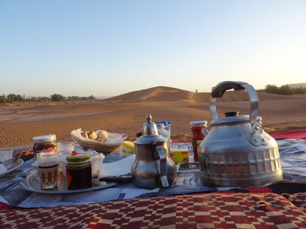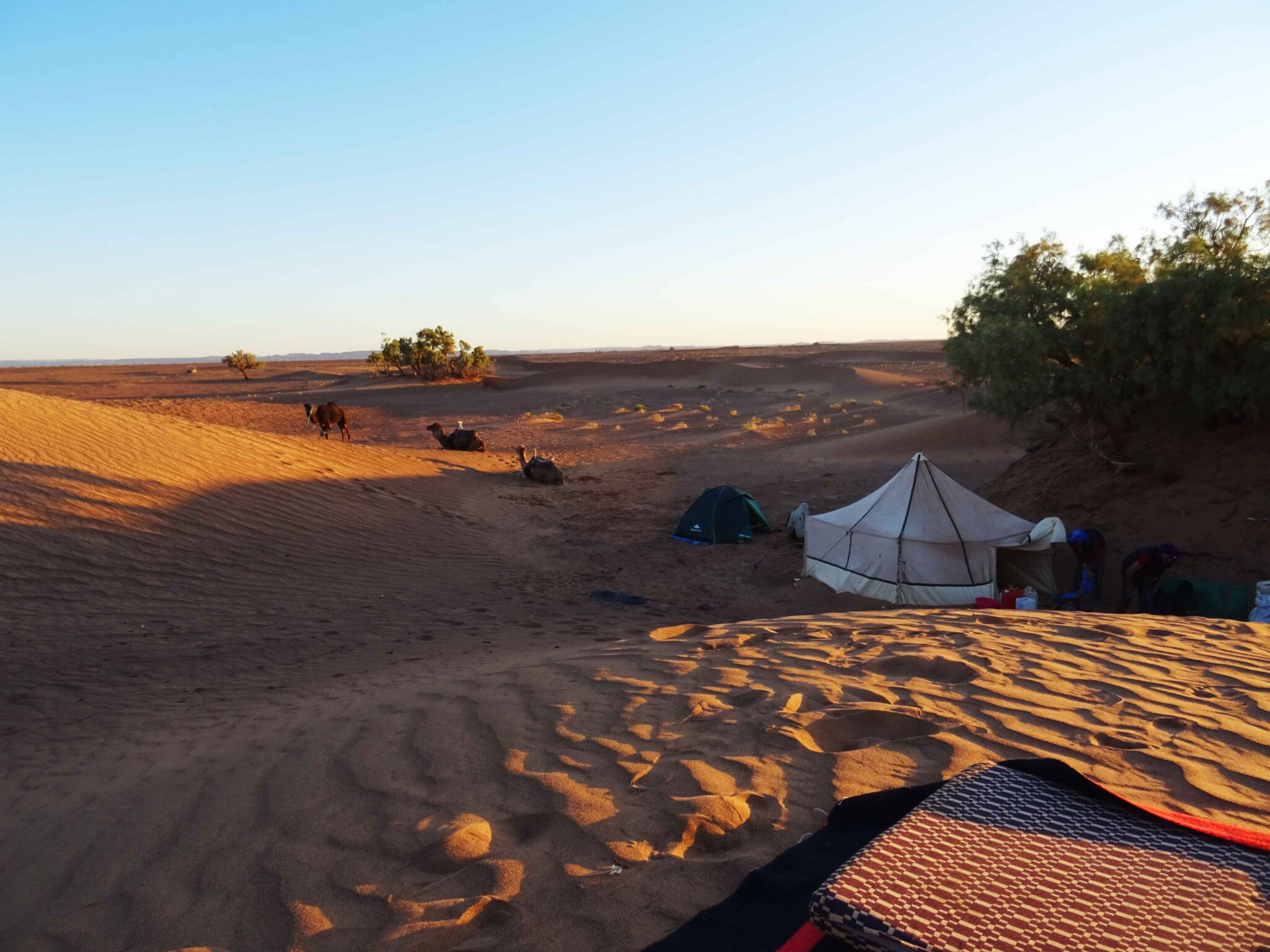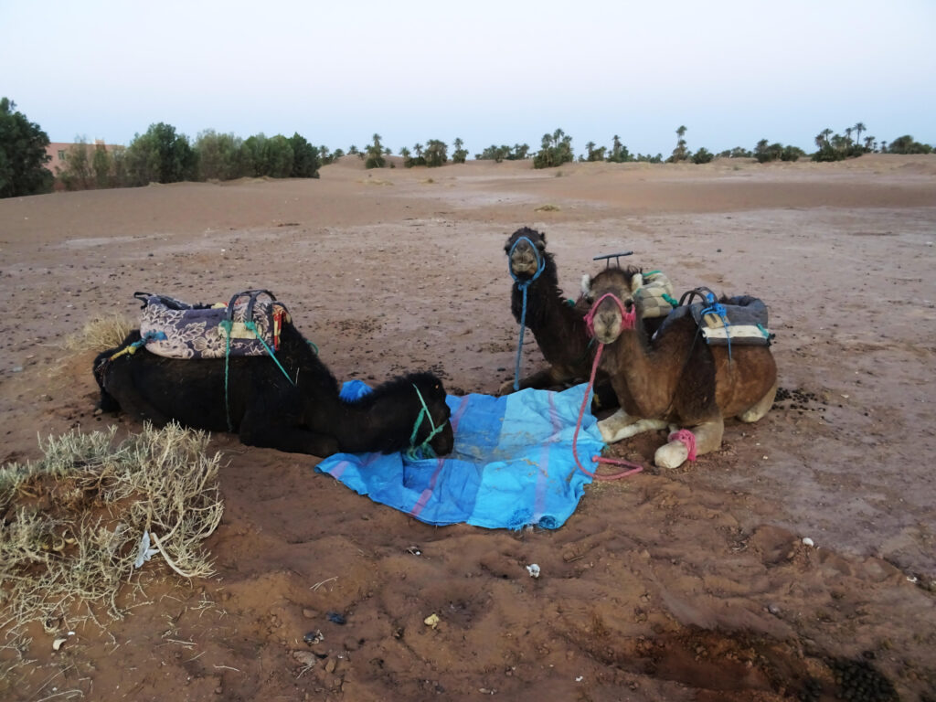 Arrivée au campement au soleil couchant, c’est l’heure du « whisky berbère » au sommet d’une dune. Le whisky berbère, c’est un tchaï (thé), servi en portant la théière le plus haut possible pour que ça fasse un maximum de bulles, petit rituel ostensible destiné à améliorer la qualité du thé. La région est particulièrement pauvre, délaissée par le gouvernement qui exploite pourtant ses gisements aurifères. Nos chameliers Mohamed et Saïd viennent du Saghro, que nous avons traversé l’année précédente. Ils transhument encore jusqu’à la vallée du Draa, qu’ils mettent environ deux semaines à atteindre depuis le Saghro. On part avec trois dromadaires, dont un jeune en dressage. Ceux-ci peuvent vivre jusqu’à 30 ans, les mâles sont utilisés pour le portage et les femelles pour l’élevage et le lait. Ils sont parfois têtus, globalement sympathiques et même affectueux. Récemment, l’un d’entre eux s’est enfui, il n’a été retrouvé que six mois plus tard dans la région, il se portait comme un charme. Les autorités algériennes ont rapporté l’avoir aperçu de l’autre côté de la frontière, qui est équipée de radars destinés à empêcher les véhicules clandestins de traverser, surtout en raison du trafic de haschisch. Malin comme un singe, le dromadaire !