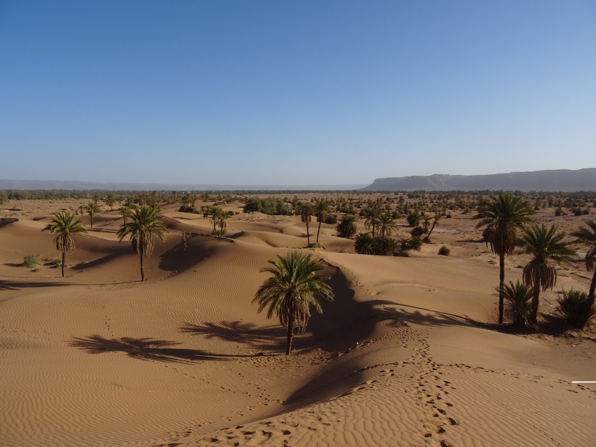 Départ dans une palmeraie entrecoupée de dunes. On suit la vaste plaine du Draa, bordée de chaque côté par des massifs tabulaires. Un lycée apparaît au milieu de la palmeraie, puis un village fortifié en pisé que nous traversons par son labyrinthe de galeries semi-enterrées. Difficile de croire que des gens y vivent encore aujourd’hui comme il y a des siècles. Distribution de chocolat, passage à l’épicerie, dîner à l’ombre d’un palmier, la chaleur coupe l’appétit. La balade se poursuit dans le cours asséché du Draa, jusqu’au bivouac localisé au pied d’un djebel dont le sommet est accessible par une dune immense. Des Berbères plantent des arbres à proximité et les arrosent à l’aide d’une génératrice. Ce procédé leur permet de revendiquer ces terres, dans un contexte de gouvernance trouble dans lequel il est demandé à chaque tribu de fixer la limite de son territoire. Au moins cela a-t-il le mérite de contribuer au reboisement d’une région subissant les affres d’une sécheresse toujours plus impitoyable. Nuit à la belle étoile, hululement lointain d’une chouette esseulée dans ce désert.