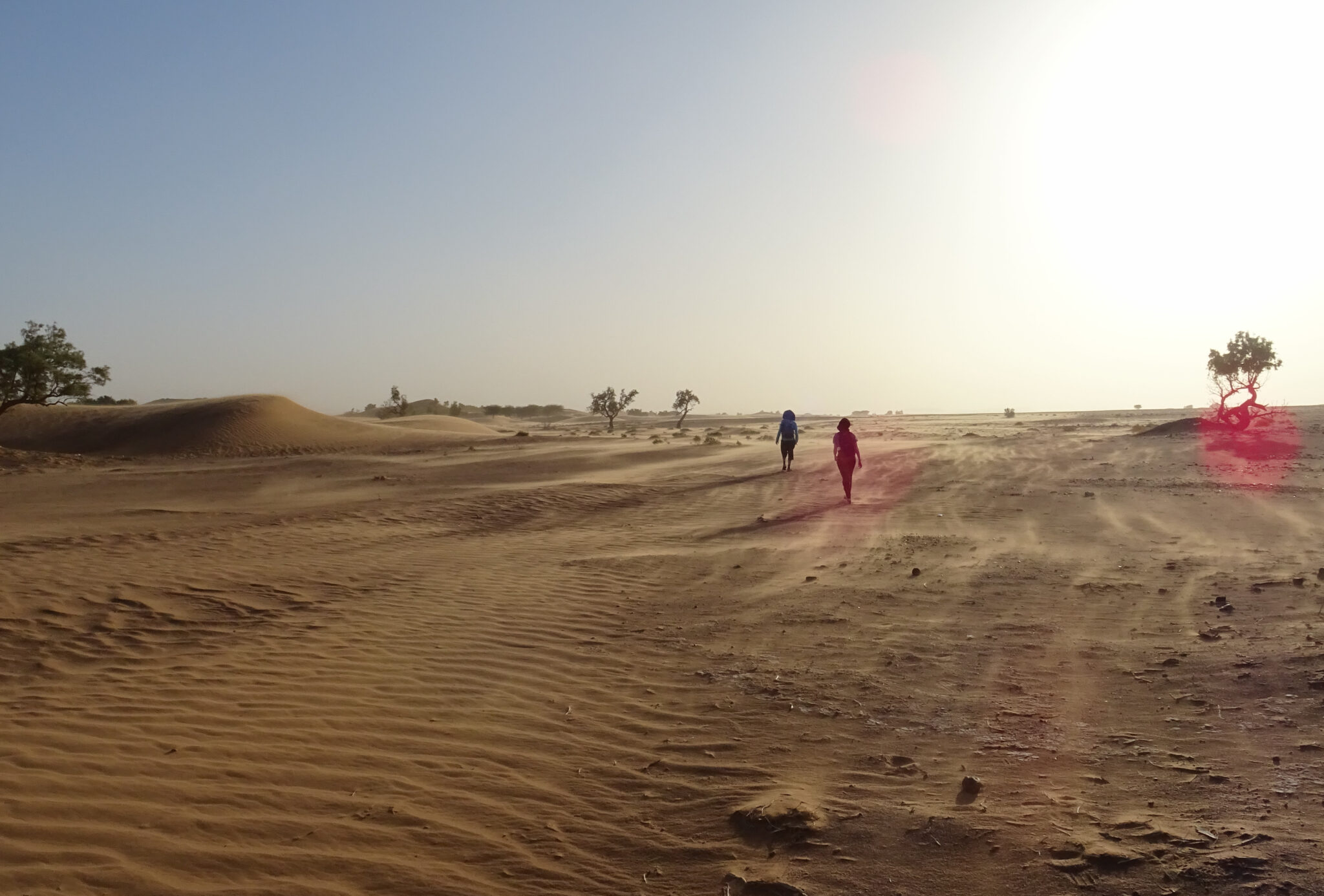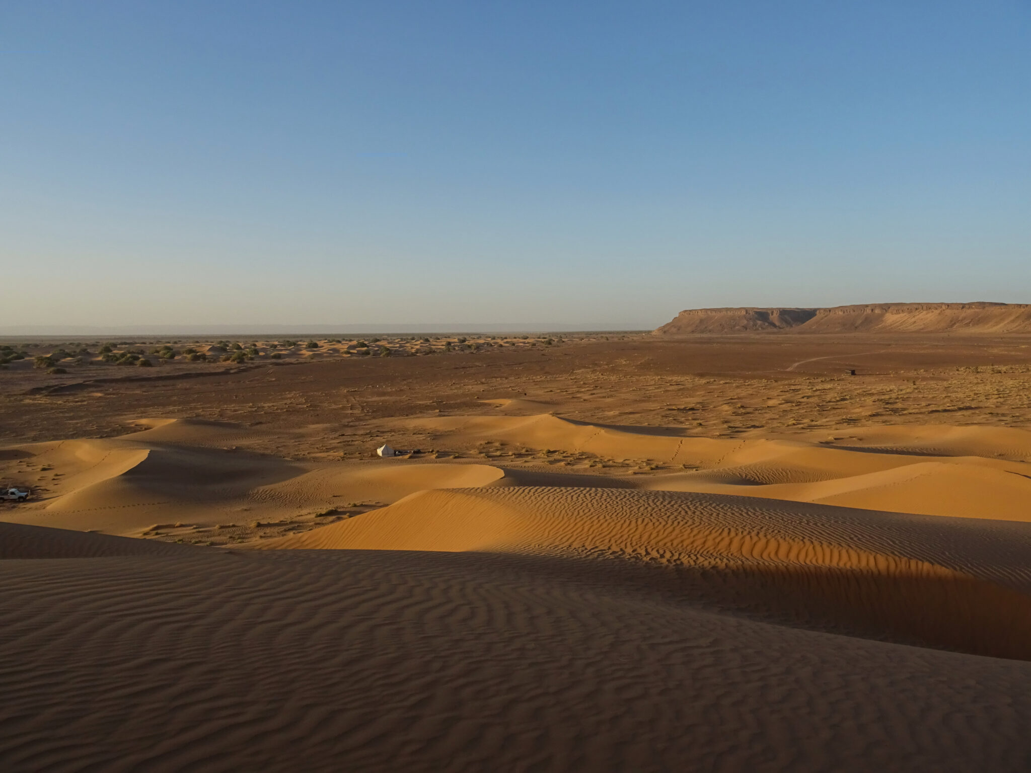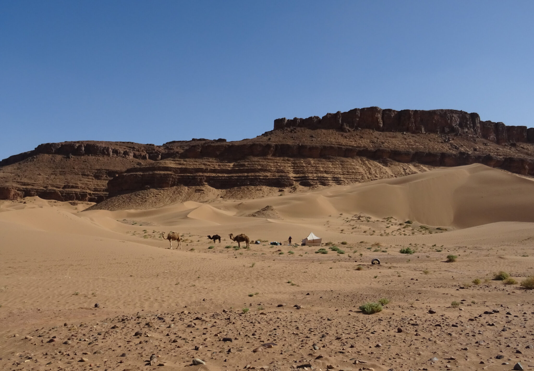 Première étape au lever du soleil : gravir le djebel, au sommet duquel se trouvent les ruines d’un imposant village fortifié. Selon Mustafa, le village aurait été fondé sous la dynastie des Almoravides il y a un millénaire de cela. Quel privilège de pouvoir visiter des sites archéologiques à des endroits aussi reculés, on a l’impression d’en être les découvreurs ! À l’horizon, on aperçoit les bases militaires marocaines indiquant la frontière avec l’Algérie. Descente plein sud, sur un plateau aride puis dunes, dunes, vent, chaleur et dunes. On y passe la journée. Au bivouac, on attend le crépuscule pour que le vent retombe, le sable fouette le visage : tous dans la grande tente, à chasser les mouches et tuer le temps à grand renfort de whisky berbères et de théories sur le monde.