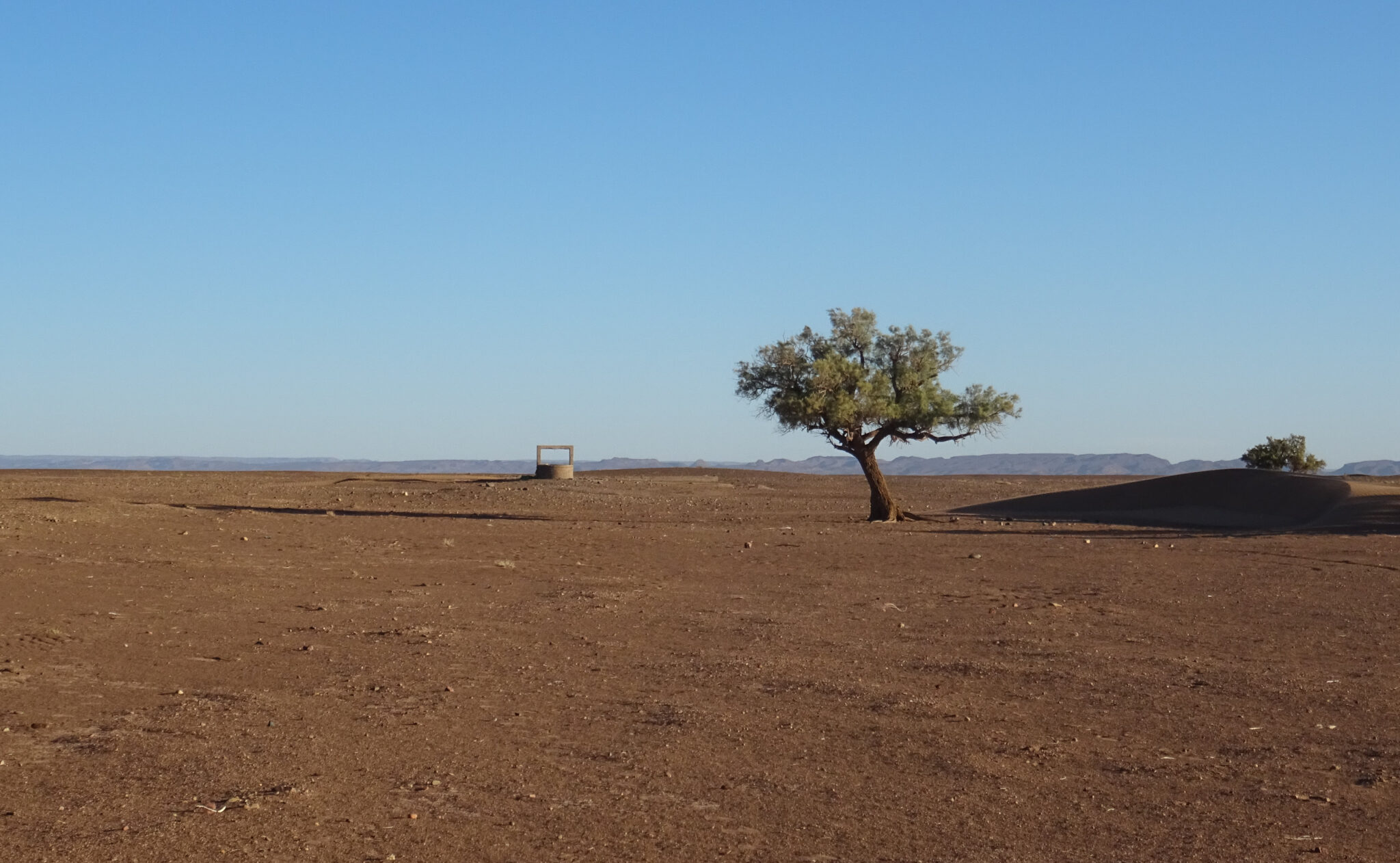 Le lendemain, on traverse le plateau de Beni Ali, recouvert des tombes et des fosses communes des soldats marocains tués durant la guerre contre l’Algérie en 1973. Tout ça pour que cette dernière gagne quelques arpents de désert sur le Maroc. Les tombes signalées par de grands cairns s’éparpillent jusqu’à la frontière actuelle. Le vent est si fort qu’après une traversée de près de 20 km, on patiente le reste de la journée dans la tente, à l’abris d’un grand tamaris, ces arbres du grand sec qui forment des dunes lorsqu’ils grandissent dans le désert. Le bivouac a du charme : dunes, tamaris noueux aussi rugueux que des peaux de dromadaires, usés par les vents du désert, et une chaîne de petites montagnes sur lesquelles nous nous rendons pour admirer le coucher du soleil. Les cairns coiffent le sommet comme de coutume, sauf que ceux-ci reposent sur une ribambelle de défunts. D’ici, l’Algérie n’est littéralement plus qu’à un jet de pierre. Sur le plateau inférieur, des milliers de fossiles marins témoignent d’une époque au moins aussi lointaine que difficile à concevoir dans l’un des environnements les plus arides au monde. À quelque distance du bivouac se dresse un puits au milieu du désert. On s’y douche au clair de lune avec une eau glaciale, fouettés par un vent frais. Puis on apprend à confectionner le pain berbère : le feu qui crépite devant la tente sert à chauffer le sable, dans lequel sont cuites les galettes.