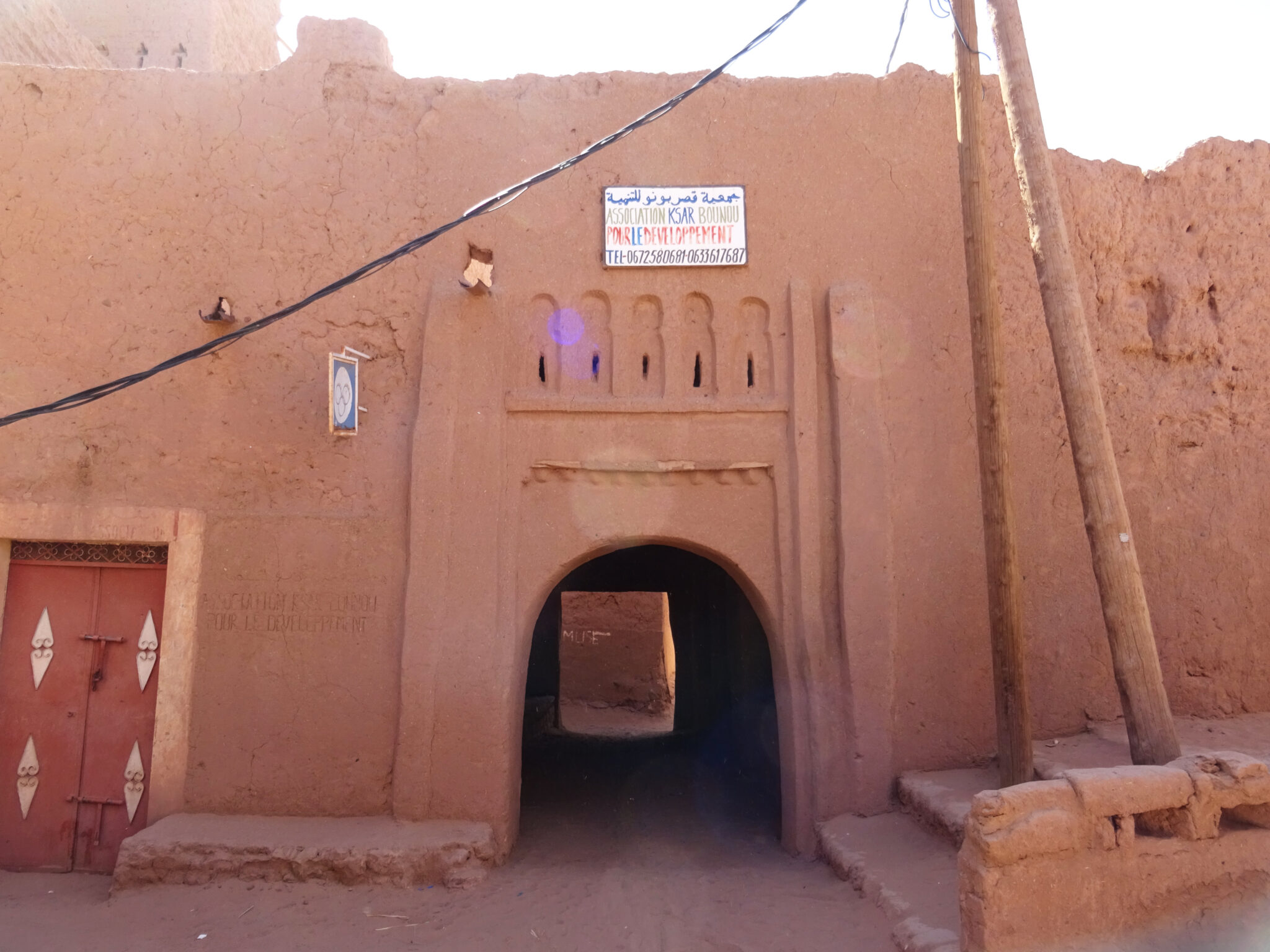 Nous quittons Marrakech avec notre guide Mustafa et le chauffeur Mohamed, qui nous avait quitté l’année précédente avec un traditionnel « insh’allah nous nous reverrons ». Mustafa vient de la région du M’Goun, comme Mohamed l’année précédente. Il a étudié le droit à l’Université de Marrakech et porte un regard critique sur la société marocaine, fier de son appartenance berbère. De Ouarzazate, on tire plein sud à travers ce que les locaux appellent le « Colorado berbère », plateau austère bordé au nord par l’Atlas et à l’est par le Saghro. Les cours d’eau sont presque à sec au fond des oueds cette année ; mauvaise saison en perspective. Puis on retrouve la verte vallée du Draa, dont le nom évoque une autre couleur : celle de ses habitants, dont beaucoup étaient des esclaves originaires d’Afrique noire et qu’on appelait les « daraoui ». Le paysage s’ouvre sur une palmeraie foisonnant à perte de vue. À Zagora, on recoupe une fois de plus la route des antiques caravanes. Un panneau indique encore…. Tombouctou, 50 jours. Nous sommes aux portes du Mali et d’une histoire millénaire. Les 10h00 de trajet sont parsemées de kasbah et de ksars (ensemble de kasbah reliées par une muraille). Sur le flanc des montagnes, une écriture géante en arabe revient à plusieurs reprises : en haut Dieu, à droite la patrie et à gauche le roi. L’usage de la géologie au service de la propagande nationale.